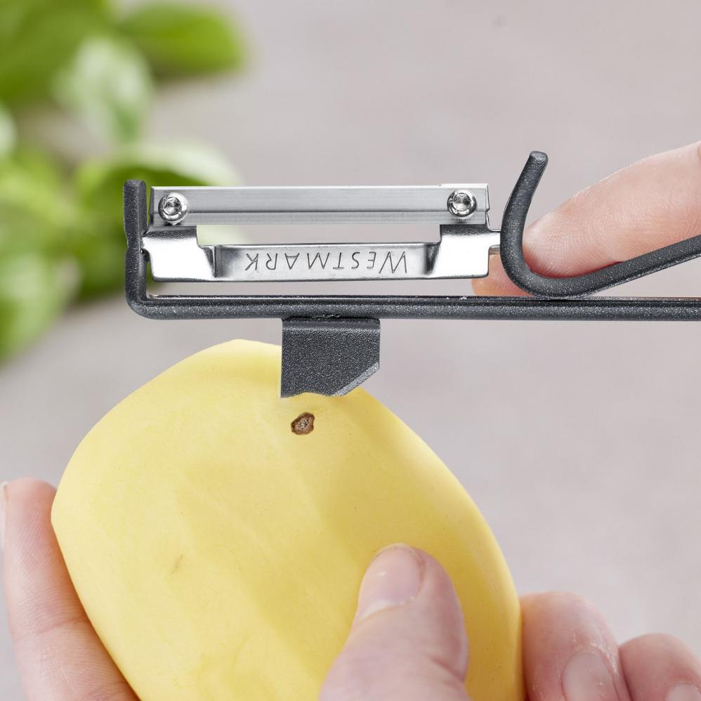 Durch die bewegliche Klinge passt sich der Schäler jeder Frucht an.