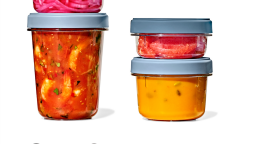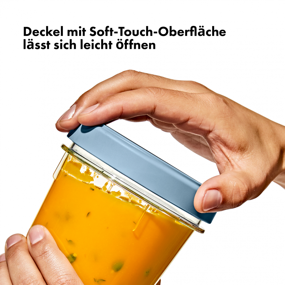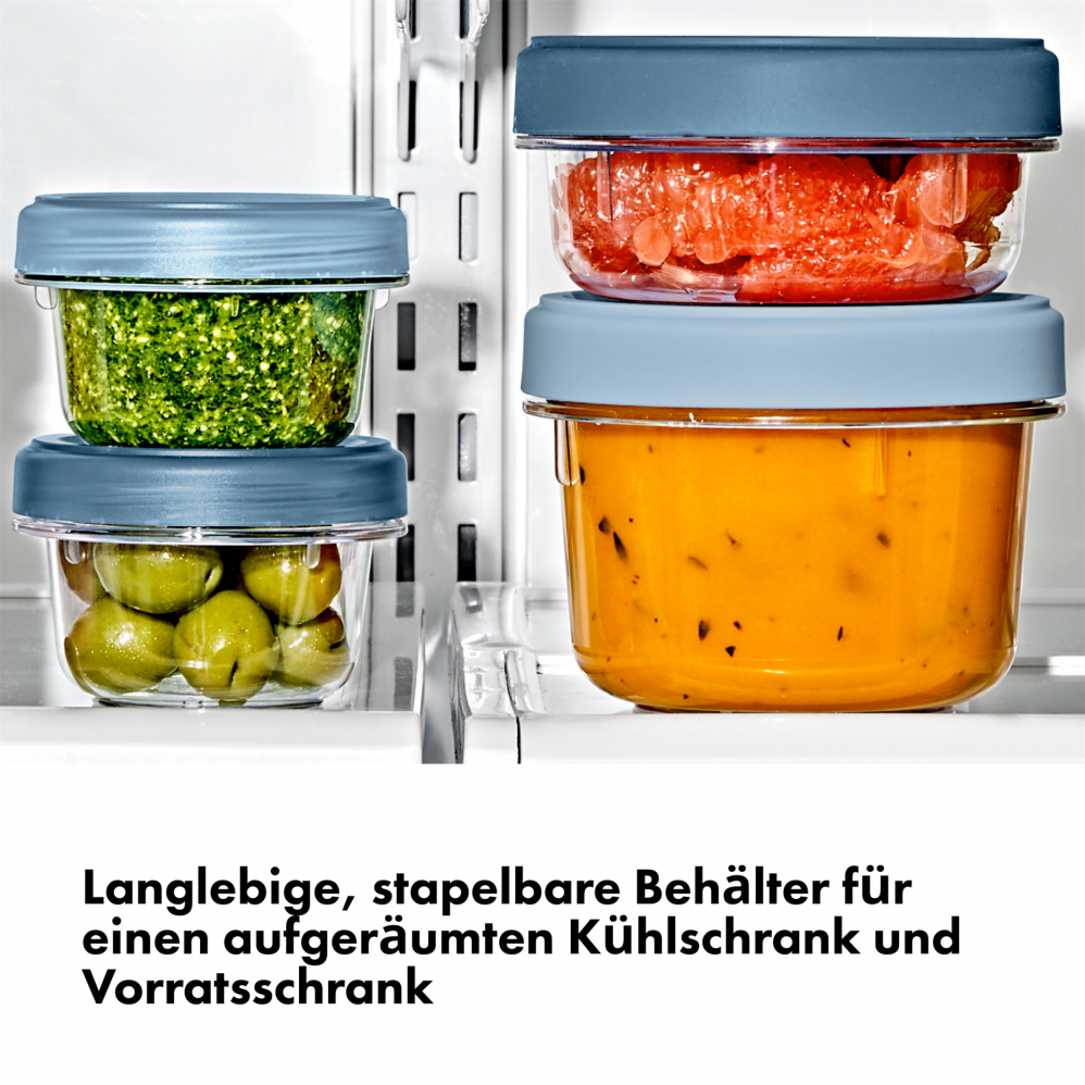 Die OXO Good Grips Twist & Stack (Drehen und Stapeln) Behälter bieten eine auslaufsichere, luftdichte Aufbewahrungslösung, die Lebensmittel frisch hält.