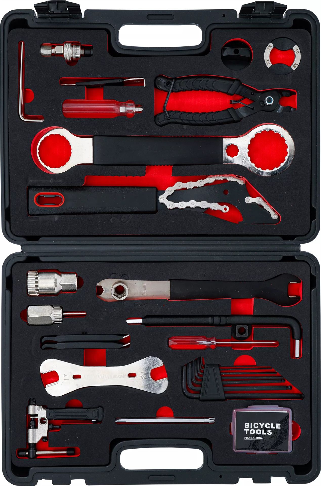 - mit dem gut ausgestatteten Werkzeug-Satz lassen sich die gängigsten Reparatur- und Wartungsarbeiten am Fahrrad durchführen