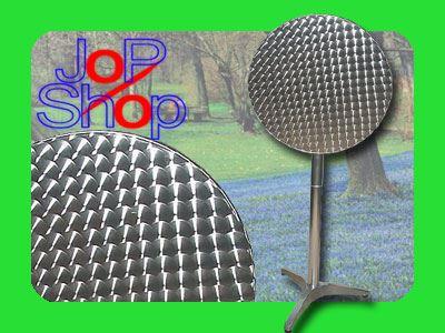 Die Tischplatte ist wetterfest und hat eine Oberfläche in Stahloptik.