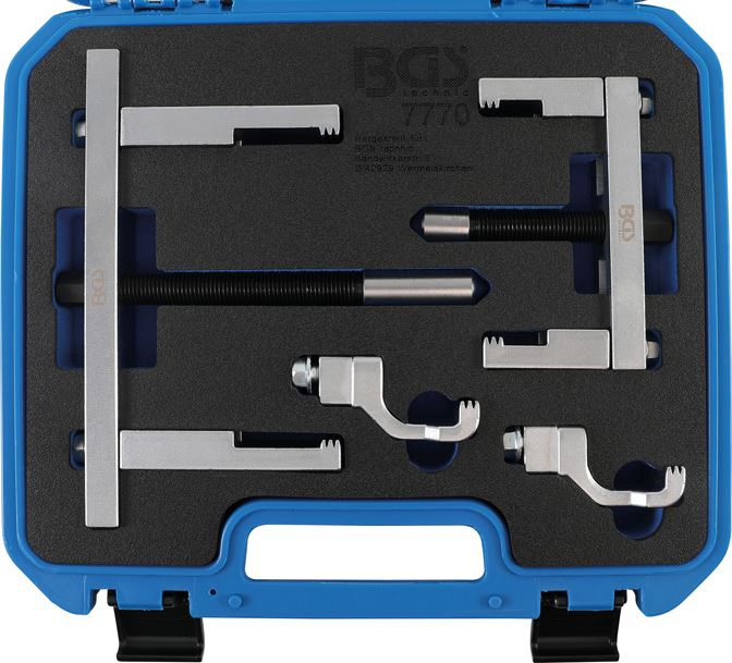zum Abziehen und Aufziehen von Riemenscheiben an Servolenkungspumpe, Lüfterrad, Lichtmaschine2 Traversen: 140 mm, 230 mm2 Paar gerade Abzugfüße: Länge 60 mm, 110 mm1 Paar Abzugfüße in Spezialform: Länge 60 mmFüße und Traversen untereinander kombinierbargeeignet für Riemenscheiben bis max. Ø 200 mm