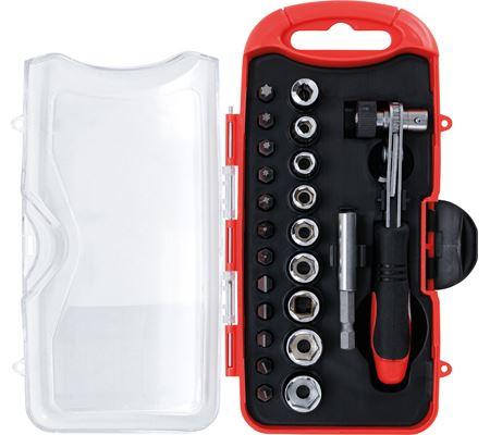 in Kunststoff-Kassette<p><strong>Lieferumfang:</strong></p>1 Magnetischer-Bithalter, Antrieb Außensechskant 6,3 mm (1/4"), Abtrieb Innensechskant: 6,3 mm (1/4")3 Bits, Antrieb Außensechskant 6,3 mm (1/4"), Kreuzschlitz PH: PH0 - PH1 - PH25 Bits, Antrieb Außensechskant 6,3 mm (1/4"), Schlitz: 3 - 4 - 5 - 6 - 7 mm4 Bits, Antrieb Außensechskant 6,3 mm (1/4"), T-Profil (für Torx): T10 - T15 - T20 - T301 Bit-Knarre, umschaltbar, Abtrieb Innensechskant 6,3 mm (1/4"), Außenvierkant 6,3 mm (1/4")8 Steckschlüssel-Einsätze Sechskant, Antrieb Innenvierkant 6,3 mm (1/4"), SW 5 - 6 - 7 - 8 - 9 - 10 - 11 - 12 mm1 Bit-Knarren-Adapter, Außensechskant 6,3 mm (1/4") - Außenvierkant 6,3 mm (1/4"), Länge: 25 mmChrom-Vanadium-Stahl