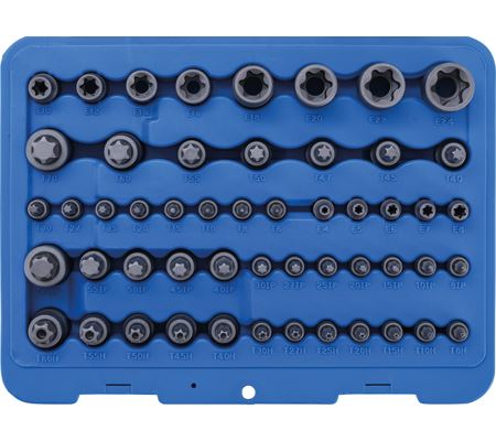 <p><strong>Lieferumfang:</strong></p>12 Bit-Einsätze, T-Profil (für Torx) mit Bohrung:Antrieb Innenvierkant: 6,3 mm (1/4"): T8 - T10 - T15 - T20 - T25 - T27 - T30Antrieb Innenvierkant: 10 mm (3/8"): T40 - T45 - T50 - T55Antrieb Innenvierkant: 12,5 mm (1/2"): T6015 Bit-Einsätze, T-Profil (für Torx):Antrieb Innenvierkant: 6,3 mm (1/4"): T6 - T8 - T10 - T15 - T20 - T25 - T27 - T30Antrieb Innenvierkant: 10 mm (3/8"): T40 - T45 - T47 - T50 - T55Antrieb Innenvierkant: 12,5 mm (1/2"): T60 - T7012 Bit-Einsätze, TP-Profil (für Torx Plus):Antrieb Innenvierkant: 6,3 mm (1/4"): TP8 - TP10 - TP15 - TP20 - TP25 - TP27 - TP30Antrieb Innenvierkant: 10 mm (3/8"): TP40- TP45 - TP50 - TP55Antrieb Innenvierkant: 12,5 mm (1/2"): TP6013 Steckschlüsseleinsätze, E-Profil (für Torx):Antrieb Innenvierkant: 6,3 mm (1/4"): E4 - E5 - E6 - E7 - E8Antrieb Innenvierkant: 10 mm (3/8"): E10 - E12 - E14 - E16Antrieb Innenvierkant: 12,5 mm (1/2"): E18 - E20 - E22 - E241/6 Einlage