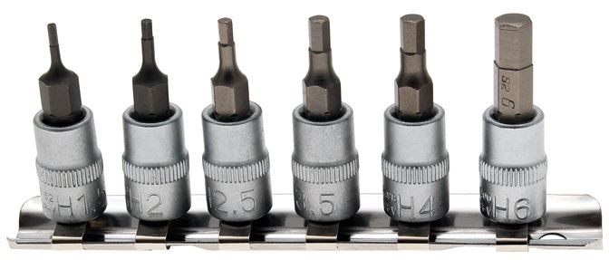 mit Rändelungauf verchromter MetallschieneBit-Einsätze, Antrieb Innenvierkant 6,3 mm (1/4"), Abtrieb Innensechskant 1,5 - 2 - 2,5 - 3,5 - 4 - 6 mmAbtriebsprofil: InnensechskantOberflächenvergütung: verchromt, mattChrom-Vanadium-Stahl