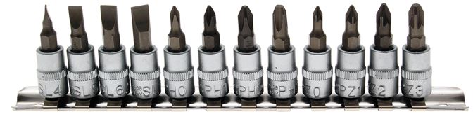 mit Rändelungauf MetallschieneBit-Einsätze, Antrieb Innenvierkant 6,3 mm (1/4"), Abtrieb Schlitz 4 - 5,5 - 6,5 - 7 mmBit-Einsätze, Antrieb Innenvierkant 6,3 mm (1/4"), Abtrieb Kreuzschlitz PH0 - PH1 - PH2 - PH3Bit-Einsätze, Antrieb Innenvierkant 6,3 mm (1/4"), Abtrieb Kreuzschlitz PZ0 - PZ1 - PZ2 - PZ3Oberflächenvergütung: verchromt, mattChrom-Vanadium-Stahl