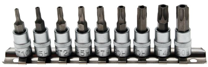 Bit-Einsatz-Satz | Antrieb Innenvierkant 6,3 mm (1/4") | T-Profil (für Torx) mit Bohrung T10 - T50 | 9-tlg.