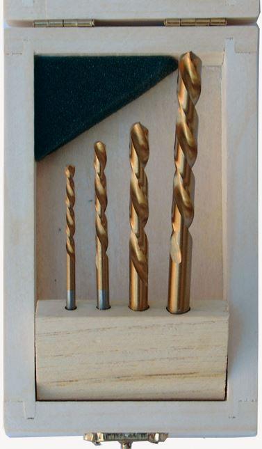 Größen: Ø 3 mm, Länge 60 mm - Ø 4 mm, Länge 75 mm - Ø 6 mm, Länge 93 mm - Ø 7 mm, Länge 108 mmzum Ausbohren abgebrochener Schraubenköpfe, Gewindebolzen etc.in Holzständer-KassetteOberflächenvergütung: titannitriert