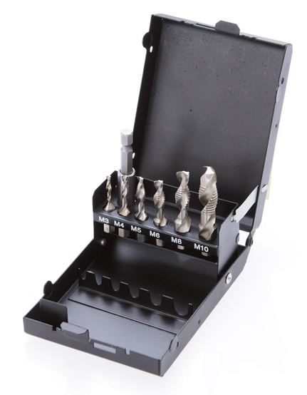 1 magnetischer Bithalter6 Kombibohrer M3 x 0,5 - M4 x 0,7 - M5 x 0,8 - M6 x 1,0 - M8 x 1,25 - M10 x 1,5alles in einem Arbeitsgang: 1. Bohren des Kernlochs - 2. Gewinde schneiden - 3. Entgraten und Senken
