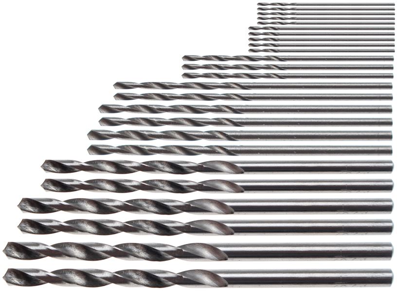 beinhaltet folgende HSS-Bohrer: 5 x 0,5 mm - 5 x 0,6 mm - 3 x 1,0 mm - 2 x 1,2 mm - 2 x 1,5 mm - 2 x 1,8 mm - 2 x 2,0 mm - 2 x 2,35 mm - 2 x 3,0 mm