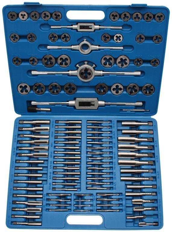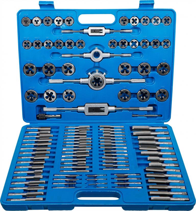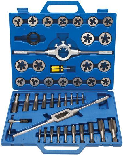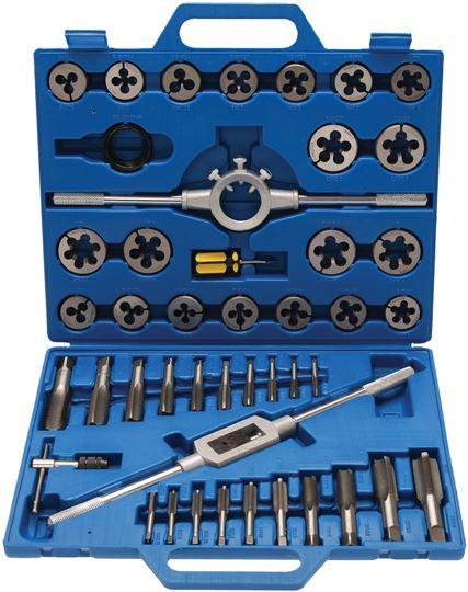 speziell für Feingewinde 2 Schneideisenhalter 2 Gewindebohrerhalter 1 T-Halter für Gewindebohrer 35 Gewindebohrer jeweils Vor-Hauptschneider, Nach-Fertigschneider und Schneideisen in folgenden Größen und Steigungen: M2 x 0.4 - M3 x 0.5 - M4 x 0.7 - M5 x 0.8 - M6 x 1.0 - M6 x 0.75 - M7 x 1.0 - M7 x 0.75 - M8 x 0.75 - M8 x 1.0 - M8 x 1.25 - M9 x 0.75 - M9 x 1.0 - M9 x 1.25 - M10 x 0.75 - M10 x 1.0 - M10 x 1.25 - M10 x 1.5 - M11 x 0.75 - M11 x 1.0 - M11 x 1.25 - M11 x 1.5 - M12 x 0.75 - M12 x 1.0 - M12 x 1.25 - M12 x 1.5 - M12 x 1.75 - M14 x 1.0 - M14 x 1.25 - M14 x 1.5 - M14 x 2.0 - M16 x 1.0 - M16 x 1.5 - M16 x 2.0 - M18 x 1.5 im Kunststoffkoffer