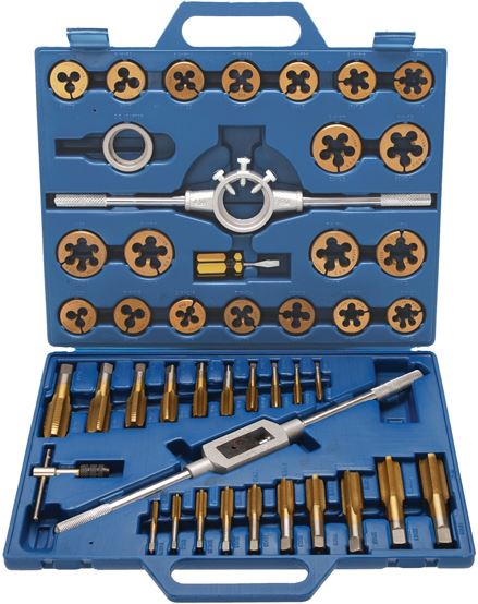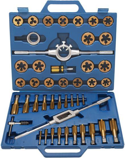 20 Gewindebohrer für Innengewinde und 20 Schneideisen für Außengewinde (1x je Größe) M6 x 0,75 - M8 x 1,00 - M6 x 1,00 - M8 x 1,25 - M10 x 1,25 - M10 x 1,5 - M12 x 1,5 - M14 x 1,5 - M16 x 1,5 - M18 x 1,5 - M20 x 1,5 - M22 x 1,5 - M24 x 1,5 - M12 x 1,75 - M14 x 2,0 - M16 x 2,0 - M18 x 2,5 - M20 x 2,5 - M22 x 2,5 - M24 x 3,01 verstellbares Windeisen1 Gewindebohrerhalter1 Schneideisenhalter1 Adapter für Schneideisenhalter1 Schraubendreher, Abtrieb Schlitz 6 mmMaterial: GCr15Oberflächenvergütung: titannitriertim Kunststoffkoffer