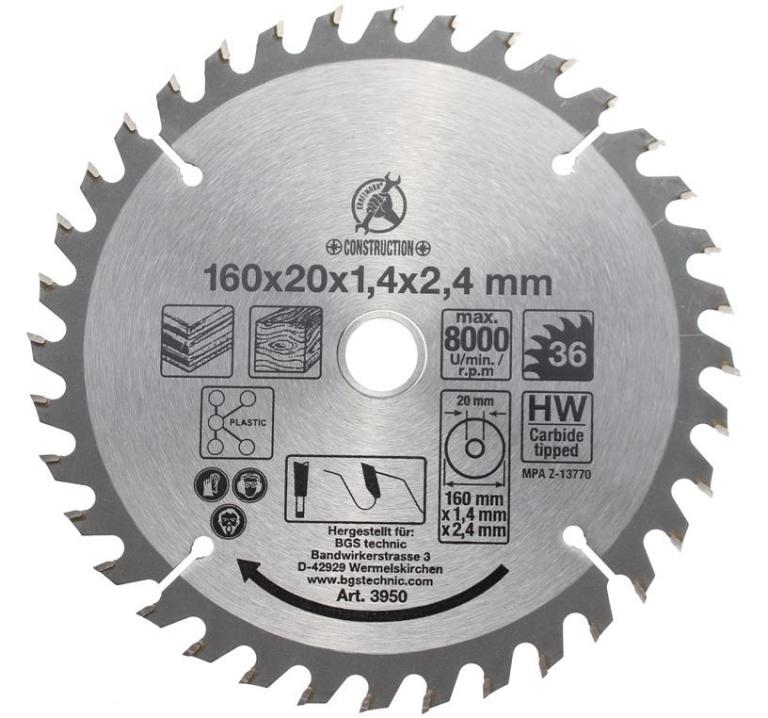 MPA zertifiziert, Bohrungsadapter 20 auf 16 mm, Zähne aus Hartmetall, Drehzahl max.: 8000 U/min, Durchmesser: 160 mm, Bohrungsdurchmesser: 20 mm, Zähne: 36pp ...