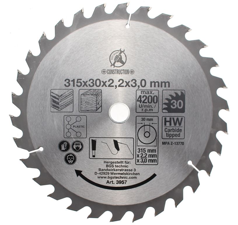 MPA zertifiziertZähne aus HartmetallDrehzahl max.: 4200 U/minDurchmesser: 315 mmBohrungsdurchmesser: 30 mmStärke Sägeblatt: 2,2 mmZähne: 30Schnittbreite: 3,0 mm