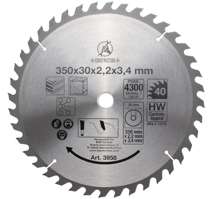 MPA zertifiziertHartmetall-ZähneDrehzahl max.: 4300 U/minDurchmesser: 350 mmBohrungsdurchmesser: 30 mmStärke Sägeblatt: 2,2 mmZähne: 40Schnittbreite: 3,4 mm