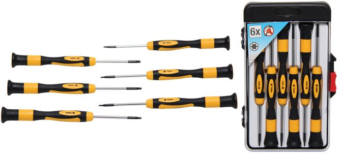 Klingen aus Chrom-Vanadium Stahlmatt verchromte Klingen mit magnetischen, schwarzen Spitzendrehbare Endkappenin hochwertiger Kunststoff-KassetteSchraubendreher, T-Profil (für Torx) T6, 50 mmSchraubendreher, T-Profil (für Torx) T7, 50 mmSchraubendreher, T-Profil (für Torx) T8, 50 mmSchraubendreher, T-Profil (für Torx) T9, 50 mmSchraubendreher, T-Profil (für Torx) T10, 50 mmSchraubendreher, T-Profil (für Torx) T15, 50 mmKlingenlänge: 50 mmGriffart: 2-Komponenten-Griff