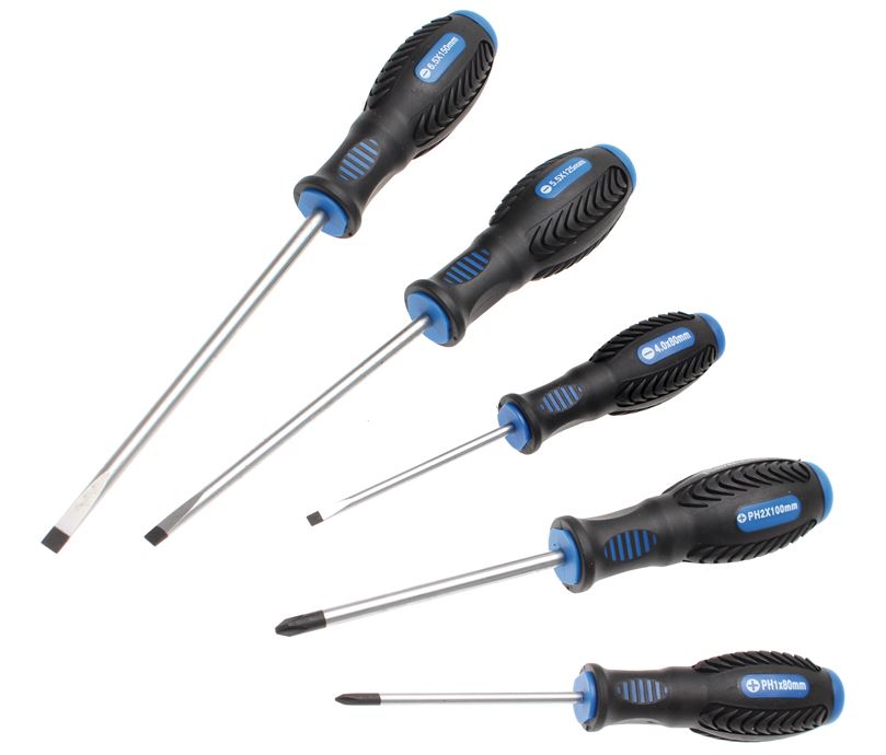 rutschsicherer 2-Komponenten-GriffSchraubendreher Kreuzschlitz PH1 x 80 mm - PH2 x 100 mmSchraubendreher Schlitz 4,0 x 80 mm - 5,5 x 125 mm - 6,5 x 150 mmChrom-Vanadium-Stahl