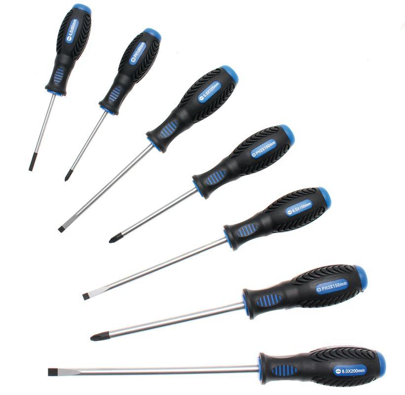 rutschsicherer 2-Komponenten-GriffSchraubendreher Schlitz: 4 x 80 mm - 5,5 x 125 mm - 6,5 x 150 mm - 8,0 x 200 mmSchraubendreher Kreuzschlitz PH: PH1 x 80 mm - PH2 x 100 mm - PH3 x 150 mmChrom-Vanadium-Stahl