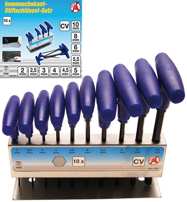 T-Griff, im Ständer, Schraubendreher mit T-Griff, Innensechskant 2 - 2,5 - 3 - 4 - 4,5 - 5 - 5,5 - 6 - 8 - 10 mmChrom-Vanadium-Stahl Marke: BGS do it yourself BG ...