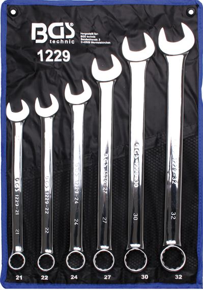 kalt geschmiedethochglanz verchromtRingende 15° abgewinkeltAbtriebsprofil Ringseite: Zwölfkantextra langin Tetron-RolltascheMaul-Ringschlüssel, Länge 300 mm, SW 21 mmMaul-Ringschlüssel, Länge 310 mm, SW 22 mmMaul-Ringschlüssel, Länge 335 mm, SW 24 mmMaul-Ringschlüssel, Länge 355 mm, SW 27 mmMaul-Ringschlüssel, Länge 420 mm, SW 30 mmMaul-Ringschlüssel, Länge 435 mm, SW 32 mmChrom-Vanadium-Stahl