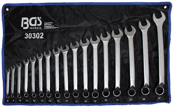 kalt geschmiedetmatt verchromtRingende tief gekröpftAbtriebsprofil Ringseite: Zwölfkantin Tetron-RolltascheMaul-Ringschlüssel SW 8 - 9 - 10 - 11 - 12- 13 - 14 - 15 - 16 - 17 - 18 - 19 - 20 - 21 - 22 - 24 - 27 mmChrom-Vanadium-Stahl