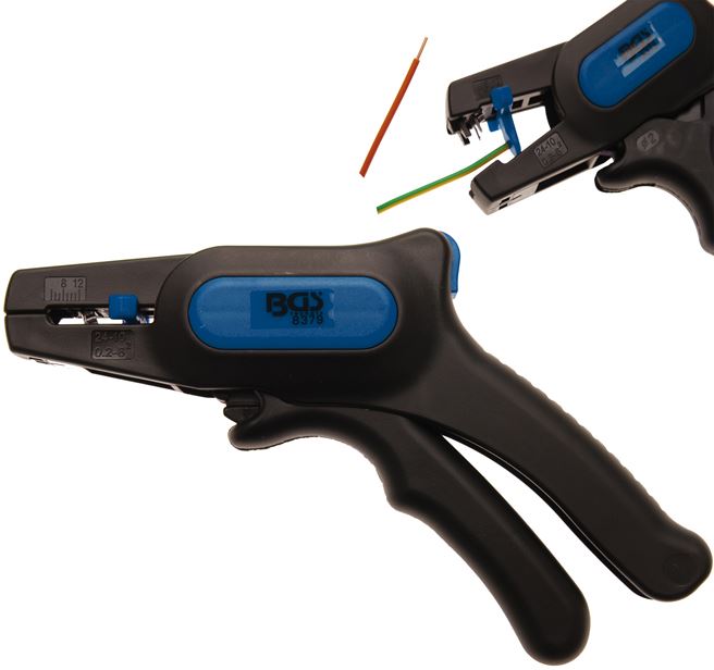 selbsteinstellend für Kabelquerschnitt Ø 0,2 - 6 mm vornschneidend, mit einstellbarem Längenanschlag für Abisolierung von 8 - 12 mm Kabelschneider bis 2 mm Durchmesser Festellung für platzsparende Aufbewahrung und Schonung der Schneidklingen