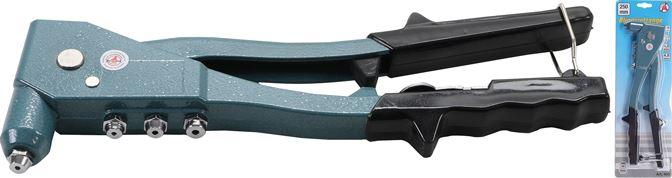 Nietzange mit 360° schwenkbarem Kopf für schwer zugängliche Bereiche schmaler Zangenkopf mit Sicherheitsarretierung am Griffende zum Verarbeiten folgender Nieten aus Aluminium-, Stahl- und Edelstahl: Standardnieten: 2,4 (3/32") / 3,2 (1/8") / 4,0 (5/32") / 4,8 mm (3/16") Nietmuttern: M3 x 0,5 / M4 x 0,7 / M5 x 0,8 / M6 x 1 Nietbolzen: M4 x 0,7 / M5 x 0,8 / M6 x 1 Lieferumfang: Nietzange Mundstücke für Standardnieten 2,4 (3/32") / 3,2 (1/8") / 4,8 (3/16") / 4,0 mm (5/32") Dorne für Nietbolzen M6 x 1 / M5 x 0,8 / M4 x 0,7 Dorne für Nietmuttern M3 x 0,5 / M4 x 0,7 / M5 x 0,8 / M6 x 1 Dornhalter M6 x 1 / M5 x 0,8 / M4 x 0,7 / M3 x 0,5 Hülse für Mundstücke Hülse für Dorne Nietbacken Maulschlüssel 5,5 x 8,5 / 12 x 17 / 15 x 19 mm